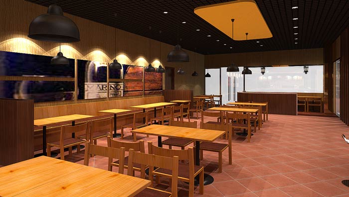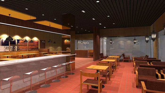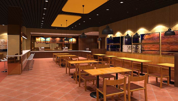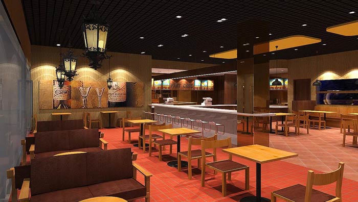 快餐店餐區(qū)裝修設(shè)計(jì):暖色系的燈光、暖色系的色彩設(shè)計(jì),給客戶(hù)一個(gè)穩(wěn)定的就餐環(huán)境,這里沒(méi)有用桔紅色,是希望給客戶(hù)一個(gè)安定的環(huán)境,業(yè)主不希望因?yàn)樯实拇碳?,造成客?hù)吃快食。