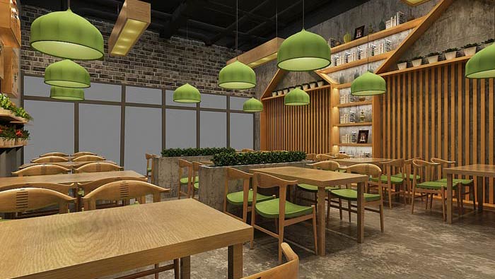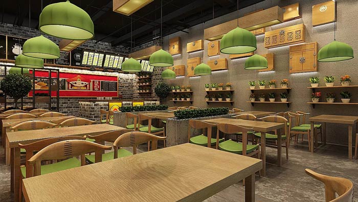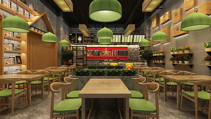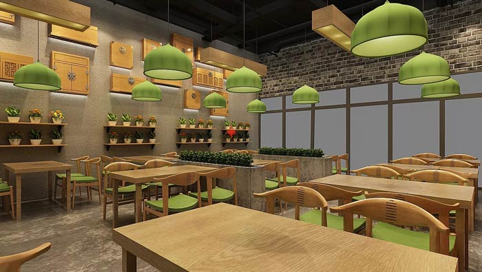中式快餐店燈飾設(shè)計(jì):綠色的燈罩、綠色的綠植、綠色的餐椅,一切的綠色設(shè)計(jì)是希望給客戶一種綠色的概念,這里的食物都是綠色無污染的,讓客戶在這里吃的放心、吃的安心。