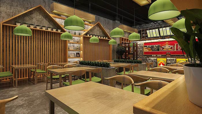 中式快餐店空間設(shè)計(jì):整個(gè)空間大致可以分為,餐區(qū)、收銀區(qū),餐區(qū)的擺放按照一定的比例進(jìn)行擺放,首先就是為了避免空間過于擁擠,誰說快餐就吃不出品味,這里快餐與品味并存。