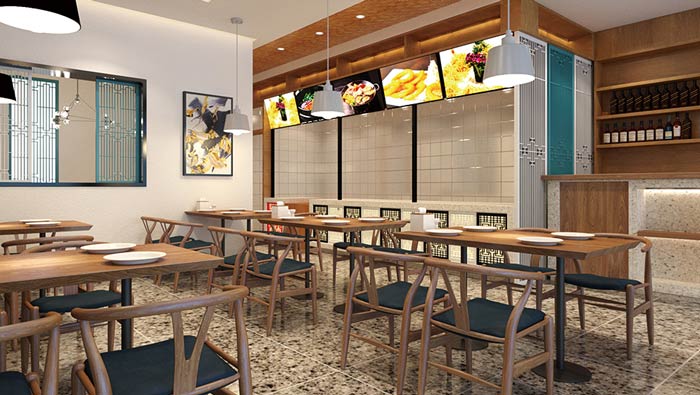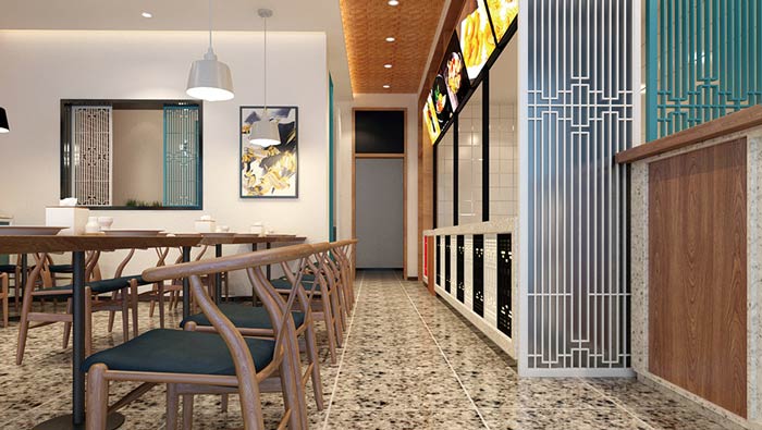 燜面館進(jìn)門區(qū)裝修設(shè)計(jì):客戶進(jìn)入空間后,首先看到的就是面館干凈、舒適的環(huán)境,這樣設(shè)計(jì)是希望通過環(huán)境留下客戶,客戶徑直走到上菜區(qū),兼顧了實(shí)用與環(huán)境的雙重標(biāo)準(zhǔn)。