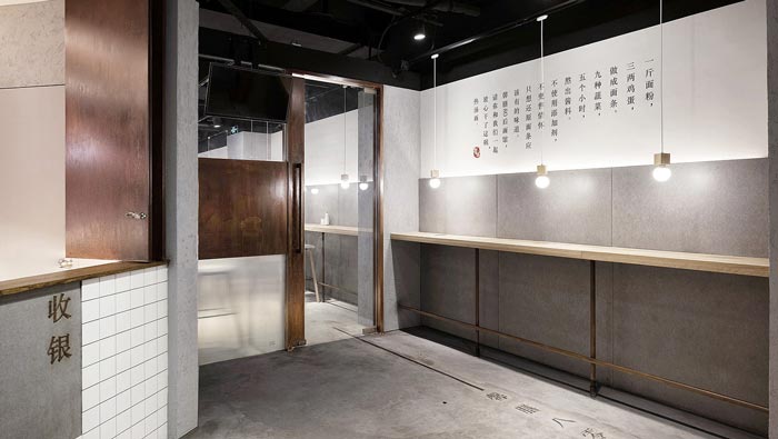 牛蛙面館餐位裝修設(shè)計(jì):對(duì)著墻壁吃面不免局促孤單,而這正是店主與設(shè)計(jì)師想傳達(dá)的理念“專心吃好一碗面”,對(duì)著水泥墻面,吊著一盞溫暖小燈,將注意力集中在食物上。