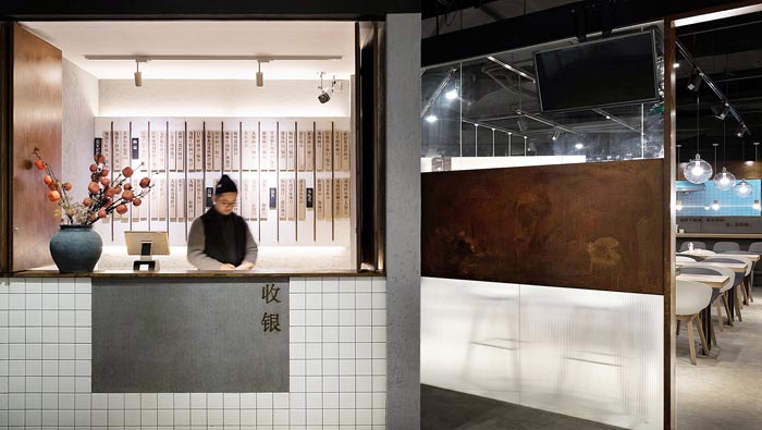 牛蛙面館空間裝修設(shè)計(jì):鋼板酸洗氧化,隨著時(shí)間的推移產(chǎn)生色澤變化,工匠的手工刷洗,留下潑墨般的痕跡,硅鈣板防潮耐污、與水泥地坪自然銜接,白橡木色澤清雅,觸感溫潤(rùn)。