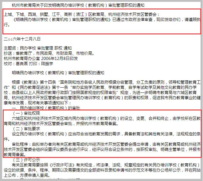 《杭州市教育局關于印發(fā)明確民辦培訓學校(教育機構(gòu))審批管理職權(quán)的通知 杭府法審告[2006]64號 》