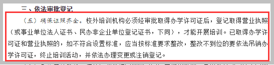 校外培訓(xùn)機(jī)構(gòu)必須經(jīng)審批取得辦學(xué)許可證后,登記取得營業(yè)執(zhí)照(或事業(yè)單位法人證書、民辦非企業(yè)單位登記證書,下同),才能開展培訓(xùn)。
