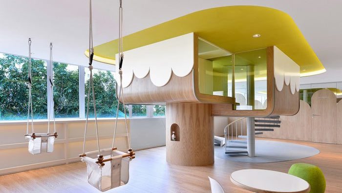 兒童教育培訓(xùn)機(jī)構(gòu)秋千區(qū)設(shè)計(jì):探索樹(shù)上小木屋,讓孩子體驗(yàn)像鳥(niǎo)一樣的自由自在,每天蕩秋千20分鐘,寶寶會(huì)快樂(lè)一整天,來(lái)源于戶外的靈感,營(yíng)造舒適的室內(nèi)玩??臻g。