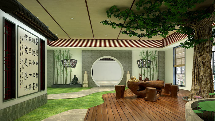 書法教育培訓(xùn)機(jī)構(gòu)庭院設(shè)計(jì):菩提本無樹,明鏡亦非臺(tái),本來無一物,何處惹塵埃,四局偈語表現(xiàn)的即是書法也是道理,表示書法的博大精深。