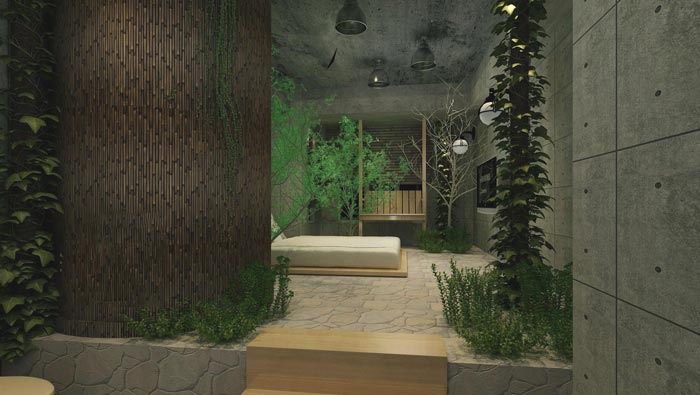 原生態(tài)客房:在這里設計師希望讓戀人之間來一場遠古的戀情,設計師將遠古森林的一個角落布置在空間之中,在這里我們仿佛置身于荒無人煙的遠古森林之中,在此處有危機、有奇遇、有著自然地狂野、有著自然的祝福,設計師希望讓戀人在這里經(jīng)歷一個不一樣的經(jīng)歷。