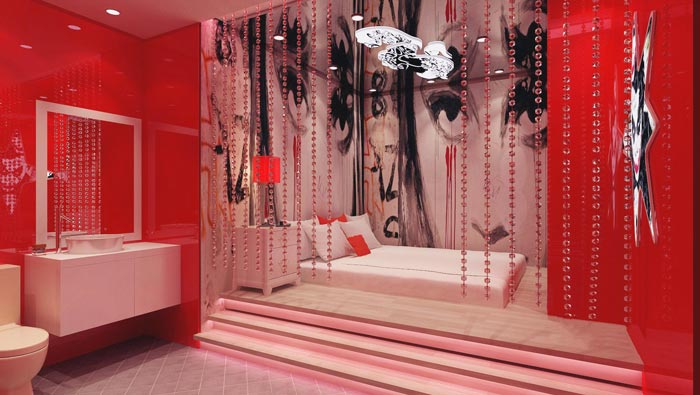 紅色誘惑客房的設計:在空間之中嫵媚的紅色讓人迷戀、讓人溫暖、讓人歡愉,這樣的設計既能增加情趣,又可以建立愛人之間貼心和浪漫的氛圍,設計師希望給愛人特別的一天,讓愛人在紅色誘惑的客房之中感受到妖嬈與誘惑,在其中有幾分性感、有幾分成熟,讓人欲罷不能。