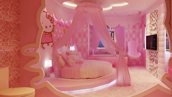 Hello Kitty客房的設計:對于女孩來說,最美好的回憶不就是從小陪伴她們的娃娃,在這里設計師希望女孩可以找回曾經(jīng)的美好,與男孩子一起分享,在分享之間雙方的情感再進一步,這樣的空間也代表著守護和疼愛,讓男孩子一生都無法忘記的美好回憶。