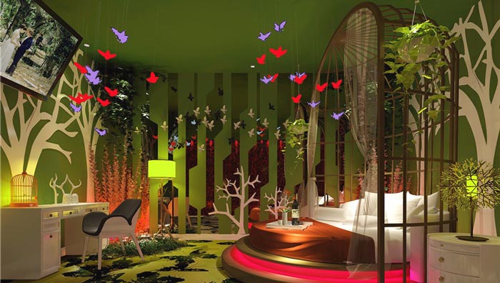 盛夏野趣客房的設(shè)計(jì):童話世界是每一個(gè)童年的夢想,在童話中有白馬王子、小精靈、魔術(shù)、巫師等等一切,設(shè)計(jì)師希望為戀人們提供一個(gè)童話世界,讓他們在這里去感悟其中的酸甜苦辣,讓彼此化身為童話的身影,去經(jīng)歷童話中的一切,讓情感得到一次質(zhì)的升華。