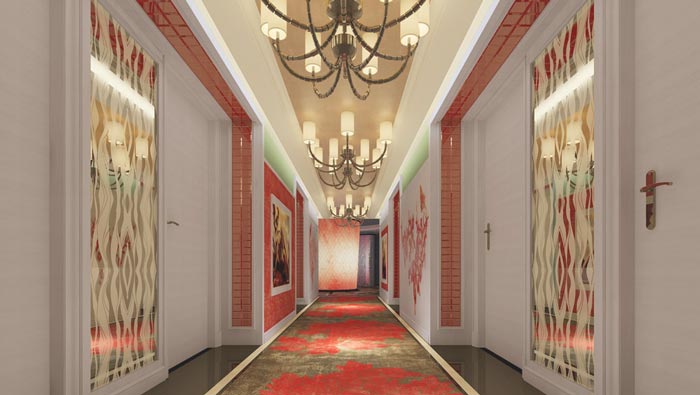 走廊的設(shè)計:在此處我們好像行走在城堡之中,這樣的感覺是那么的與眾不同,戀人在這里感覺自己就是這里的主人,這也是設(shè)計師希望給大家的一種感覺,設(shè)計師希望剝離酒店的陌生之感,因為在設(shè)計師看來,很多酒店給客戶的感覺就是熟悉的陌路人,即熟悉又那么的陌生,這也是設(shè)計師需要盡量避免的。