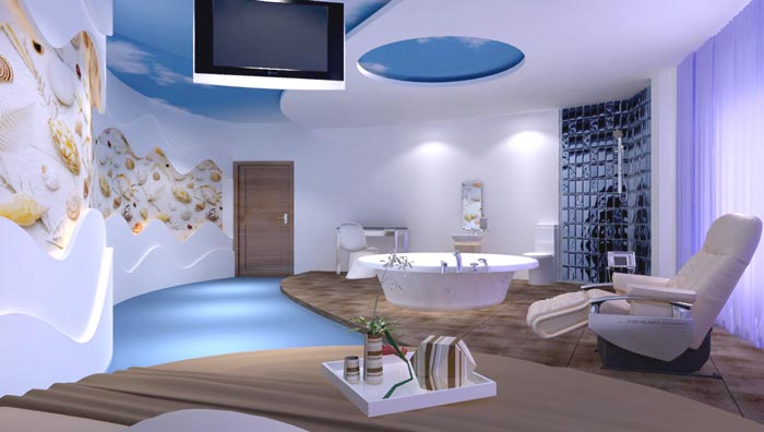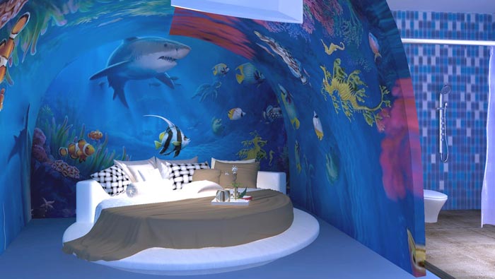 海底客房的設(shè)計:在此次戀人們仿佛變成了無憂無慮的魚兒,去探險那未知的海底世界,在這里他們會見到千奇百怪的海底生物,設(shè)計師希望讓他們,在這里來一次十分有意義的旅行,以此填補人們對于海底世界的無知,給戀人們一個美好的旅行,屬于兩個人之間的秘密。