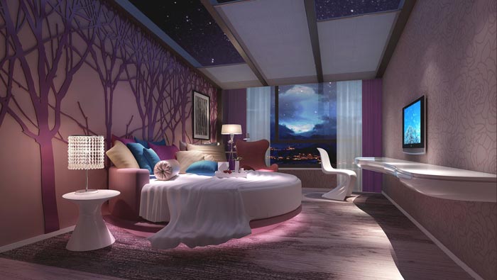 星空客房的設(shè)計:當戀人依偎在一起看向遠方星空的時候,不禁會被天邊那一閃一閃的星光所迷醉,在這里時間仿佛停止了、空間仿佛不在了,有的只是霎那瞬間,在此時他們的眼中只有彼此,此情此景不禁羨煞旁人,在純凈的星光照耀下,戀人仿佛是受到了星光與月光的祝福。
