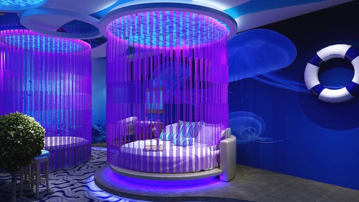 夢(mèng)幻客房的設(shè)計(jì):在這里戀人們仿佛來(lái)到了一個(gè)夢(mèng)幻的世界,在這里戀人可以度過(guò)自己的二人世界,在這里戀人們好似在海底,在海底遨游、在海底觀賞,戀人們相互依偎在一起觀賞者外面的世界,一切都是那么的美好,在這里戀人將度過(guò)一個(gè)與眾不同的夜晚。