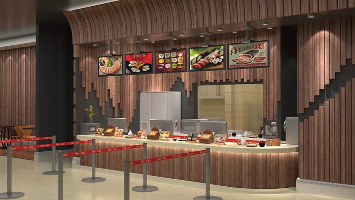 日式快餐廳收銀區(qū)設計:在這里設計師的設計重點就是分流,設計師要做的就是將人流導向更加的合理化,避免出現(xiàn)空間的擁擠,讓客戶從進門到用餐都體會到井然有序。