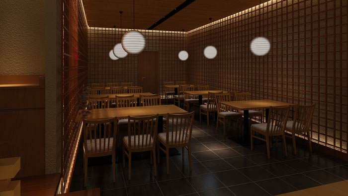 日本料理餐廳餐區(qū)設計:這里由兩人餐區(qū)、四人餐區(qū)構成,四人餐區(qū)位于空間的左側,兩人餐區(qū)位于空間的右側,同一個空間采用兩種不同的布局方式,將空間使用最大化。