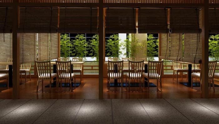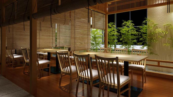 日本料理餐廳過道餐區(qū)設計:竹子為空間帶來了一絲綠色,整個空間看起來郁郁蔥蔥,下雨天的時候,客戶在這里吃飯、聊天,看著室外的雨水,也是一個不錯的享受。