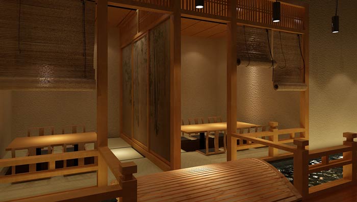 日本料理餐廳包廂設計:包廂位于水流的一邊,流水從包廂的門口流過,讓空氣格外清新,拱橋的設計讓人仿佛回到了過去,在這里客戶將享受到不一樣的就餐環(huán)境。