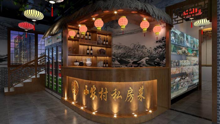 農(nóng)家私房菜進門區(qū)設計:小農(nóng)村私房菜,六個字給客戶以直觀的感受,鄉(xiāng)村樣式的柜臺、加上中式的元素,讓時間在這里慢了下來,讓客戶享受美食真正的味道。