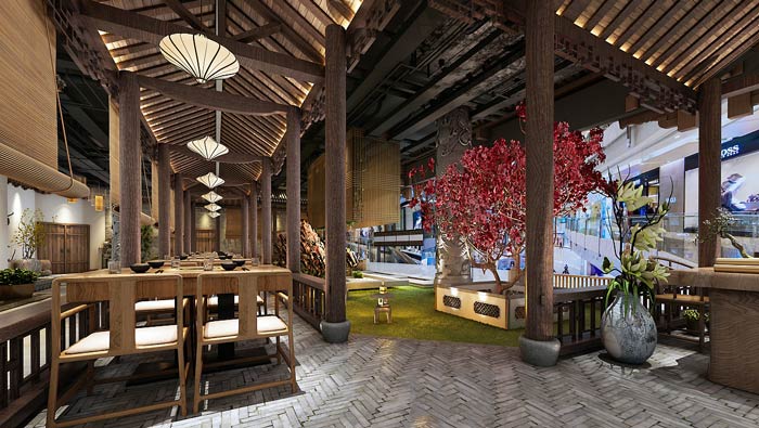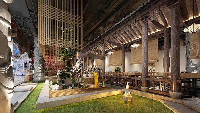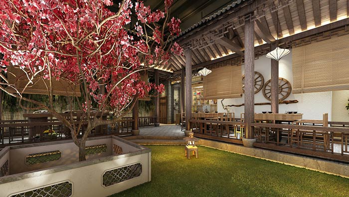 特色私房菜館花園設計:亭臺樓閣中的花園是空間中的一大亮色,這里自然的氣息非常濃郁,這里也是空間的中心區(qū)域,其他區(qū)域圍繞著花園,讓整個餐館空間充滿綠色。