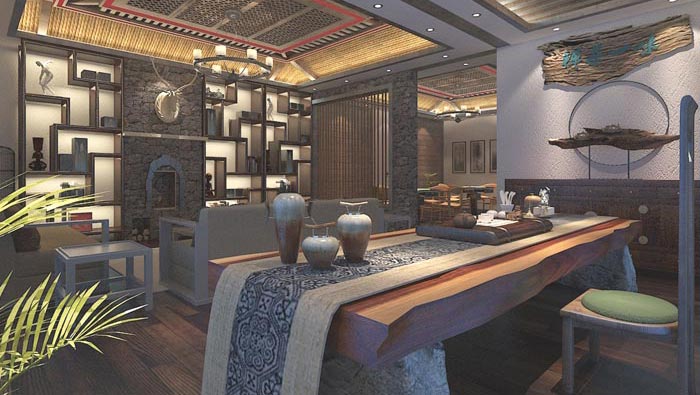 前臺的設(shè)計:當顧客進入空間之后,仿佛進入到一個茶室,同時中式的裝飾引入我們的眼簾,中式是中華文化的延伸,在這里顧客感受到的是博大精深的中華文化,這樣的環(huán)境可以讓人的心慢慢的放松下來,在這里沒有繁雜的社會、沒有快速的生活、沒有吵雜的環(huán)境,有的只是安靜的氛圍,讓我們感受到生命的美好。