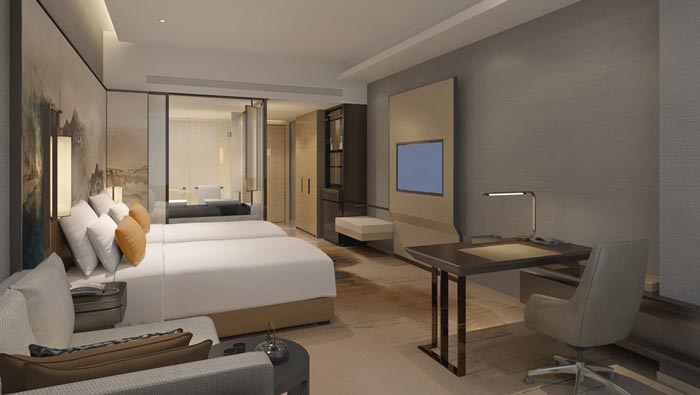 大床房A型客房的設(shè)計:當顧客拖著勞累的身心進入空間之后,設(shè)計師希望給他的是輕松與舒適,顧客可以先躺在靠近窗邊的躺椅上稍事休息,當我們俯身看向外面的時候,一切都變的那么小,在這里一切都離我們越來越遠,在這樣的情境中,讓自己的內(nèi)心得到舒緩。