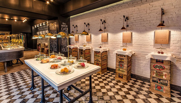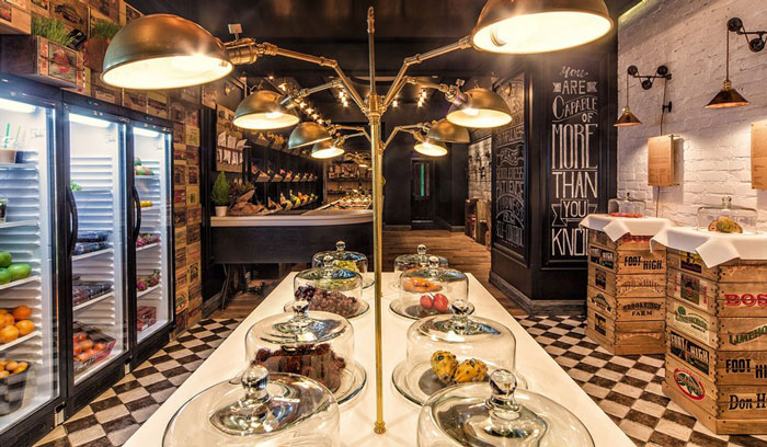 設計理念:復古的設計風格希望能為以健康生活方式為理念的擁護者,打造一個放松舒適俱樂部的氛圍,提供客人新鮮的水果、果汁、沙拉、果醬或是葡萄酒,也希望讓客人了解以水果為主的飲食習慣的優(yōu)點。