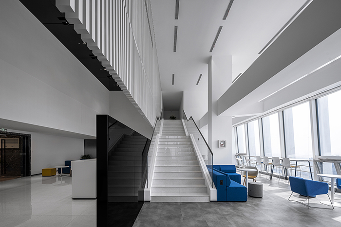 這是一個(gè)半導(dǎo)體公司在上海的新辦公室,該辦公室有6000平米,企業(yè)提倡“享受科技,享受生活”的理念,辦公室整體以藍(lán)白色調(diào)為主,其中藍(lán)色代表科學(xué)、理性思考、未來(lái)等。