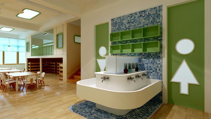 洗手區(qū)域的設(shè)計(jì):此處通往的是就餐區(qū),在洗手池的設(shè)計(jì)上,設(shè)計(jì)師對(duì)地面、洗手池都做了處理,目的就是為了避免因?yàn)樗斐傻牡孛鏉窕?,兩個(gè)門(mén)一個(gè)進(jìn)一個(gè)出,設(shè)計(jì)是希望可以從小培養(yǎng)孩子排隊(duì)的意識(shí),一進(jìn)一出之間也見(jiàn)證了教育的重要性。