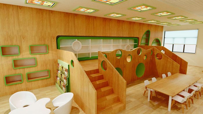 娛樂(lè)區(qū)域的設(shè)計(jì):此處與就餐區(qū)域融合在一起,當(dāng)就餐結(jié)束20分鐘以后,孩子們可以在這里盡情的玩耍,玩耍是孩子的天性,設(shè)計(jì)師希望可以將其進(jìn)一步的延伸,讓孩子在玩耍中不斷地成長(zhǎng),當(dāng)玩耍累了之后,孩子們可以坐在一起看看漫畫(huà)、圖書(shū),課外生活也是一樣的精彩。