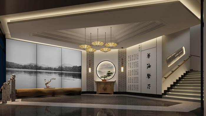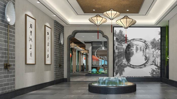 特色中餐廳中庭設(shè)計:此處做為進(jìn)門區(qū)與內(nèi)部空間的連接地,空間中有書法字體、有噴泉清水、有特色拱橋、有特色的燈飾,一切元素在空間中相互融合。