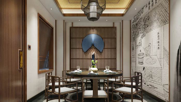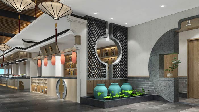 特色中餐廳裝飾設(shè)計:松柏、瓷器、荷花、燈籠、銅錢、中式建筑,各種各樣的元素在空間中出現(xiàn),讓客戶有一種恍如隔世的感覺,在這里視覺、味覺、精神的享受達(dá)到平衡。