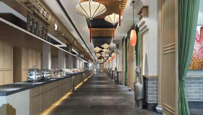 特色中餐廳上菜區(qū)設(shè)計:餐區(qū)按照左中右的方式進(jìn)行設(shè)計,左邊為上菜區(qū)、中間為過道、右邊為就餐區(qū),設(shè)計師在每一個就餐區(qū)都配有上菜區(qū),目的就是希望讓就餐井然有序。