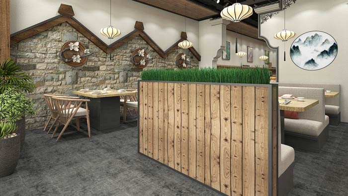 小型中式餐廳進(jìn)門區(qū)設(shè)計(jì):這里沒(méi)有高樓大廈,有的只是老建筑,客戶來(lái)到這里是尋求心靈的寧?kù)o,在餐廳內(nèi)部的設(shè)計(jì)中設(shè)計(jì)師以寧?kù)o為主線,讓客戶在這里收獲寧?kù)o的心情。