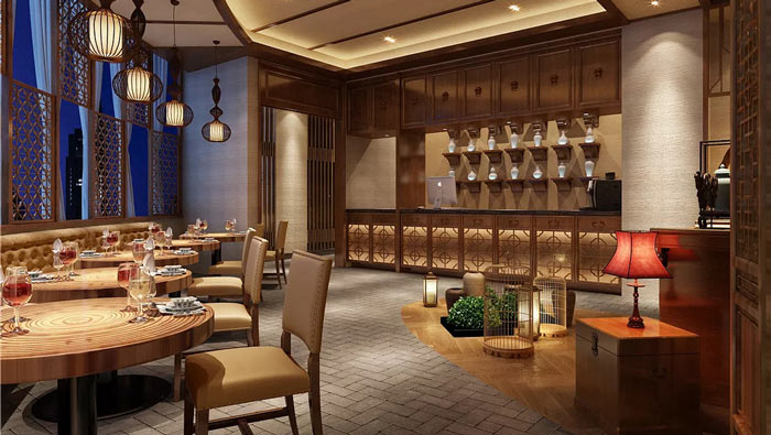 中式餐廳進門區(qū)設(shè)計:客戶進入空間之后,首先感受到的就是古色古風(fēng),在這里客戶與快速的時代暫時脫離,在這里開啟客戶的慢生活。