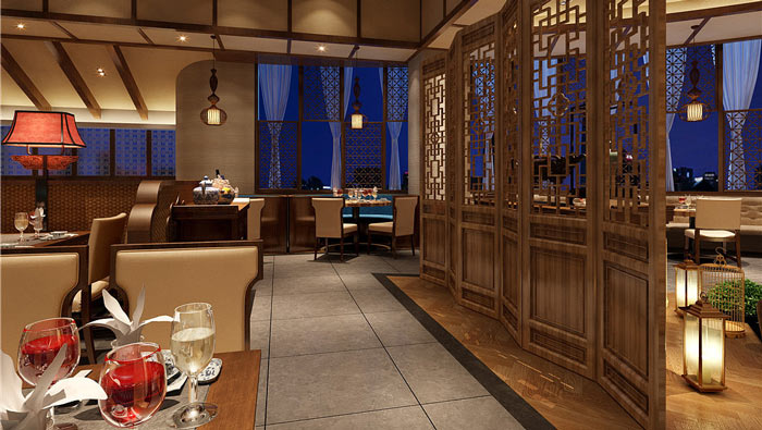 中式餐廳內(nèi)外入口設(shè)計:此處是室內(nèi)與陽臺的連接處,入則在室內(nèi)、出在在室外,室內(nèi)室外給人的感覺完全不同,內(nèi)部環(huán)境幽靜、外部環(huán)境接近自然。