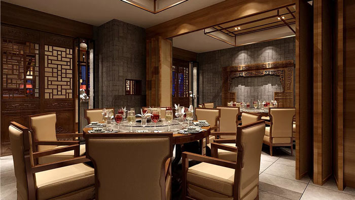 中式餐廳包廂設(shè)計:包廂采用兩合一、一合二的設(shè)計,當(dāng)中間的門打開的時候,兩個空間合成一個空間,當(dāng)中間的門關(guān)上的時候,一個空間分成兩個空間。