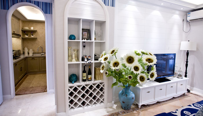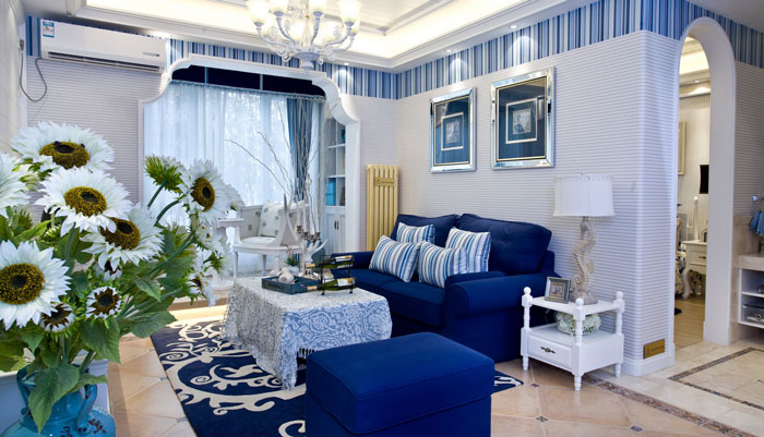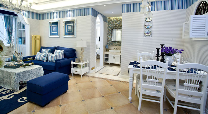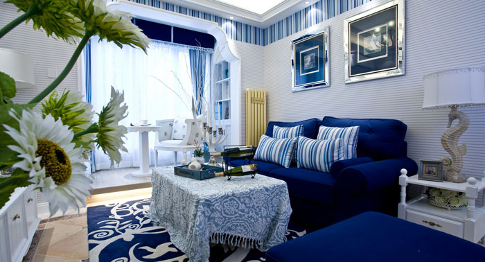 多以藍白色調(diào)為主,空間布置中加入海洋類裝飾物件,如帆船貝殼之類,地中海風格客廳中條紋沙發(fā)占有主要點綴作用。