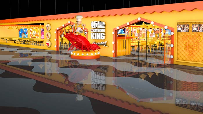 小龍蝦主題餐廳門頭設(shè)計(jì):小龍蝦的標(biāo)志幾乎無處不在,目的就是希望客戶,無論從哪方面都可以直觀的感受到空間的屬性,這是要打造無死角的運(yùn)營基礎(chǔ)。