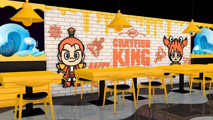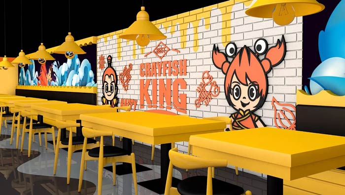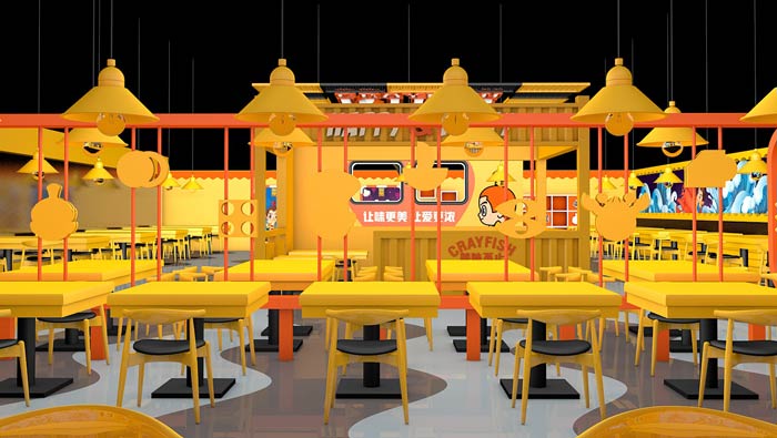 小龍蝦主題餐廳平面設(shè)計(jì):所謂的平面設(shè)計(jì),就是人平時(shí)看到的樣子,任何事物第一眼都十分重要,黃色的空間讓人難以忘懷,這就是設(shè)計(jì)師要做的設(shè)計(jì)營銷。