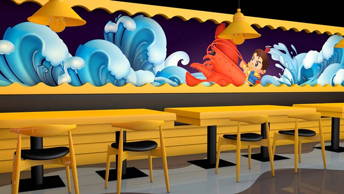 小龍蝦主題餐廳墻畫設(shè)計(jì):一幅墻畫就是一個故事,設(shè)計(jì)師希望餐廳也擁有自己的內(nèi)涵、也有自己的文化、自己的特色,讓客戶慕名而來、滿意而歸。