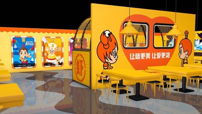 小龍蝦主題餐廳人物設(shè)計(jì):整個空間的人物、墻畫、餐桌、燈光宛若一體,流線型的空間符合大眾的審美,在這里小龍蝦就是空間,空間就是小龍蝦,不分彼此。