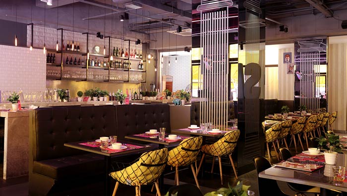 主題餐廳門(mén)頭設(shè)計(jì):全透明的玻璃隔斷,將室內(nèi)室外完全連在一起,讓過(guò)路人可以清晰看到室內(nèi)的景色,這不僅可以提升餐廳的知名度,同時(shí)也可以增加空間的視覺(jué)效果。