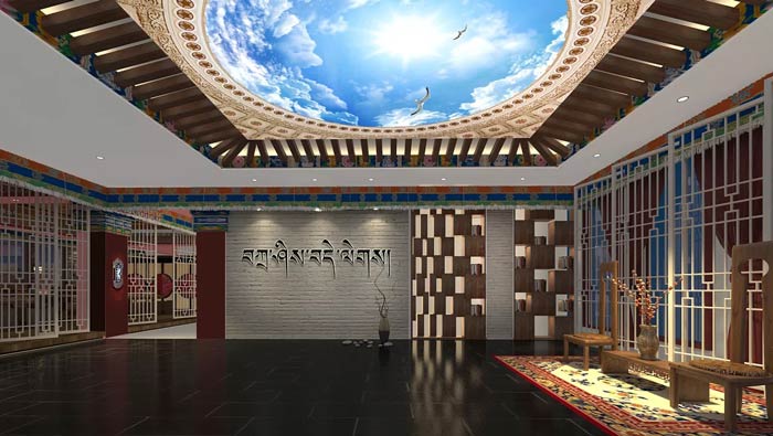 藏式主題餐廳進(jìn)門(mén)區(qū)設(shè)計(jì):設(shè)計(jì)師首先表達(dá)的就是藏族文化【文字】,其次表達(dá)的就是西藏的自然風(fēng)景,雄鷹在藍(lán)天自由的翱翔,以此展示豐富、燦爛的藏族文化。