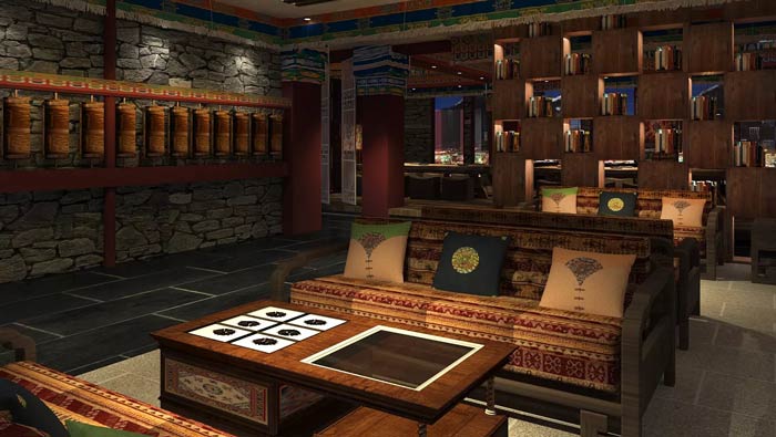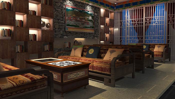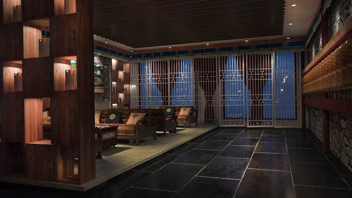 藏式主題餐廳等待區(qū)設(shè)計(jì):當(dāng)餐廳爆滿的時(shí)候,客戶將在這里等待,客戶可以在這里看看書(shū)、聊聊天,以此抵消等待的煩惱,這也是設(shè)計(jì)師希望看到的。