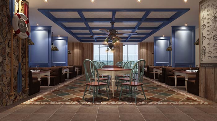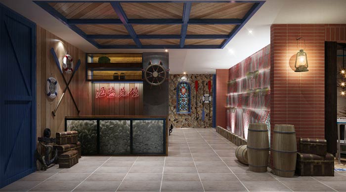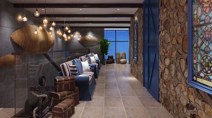 主題餐廳過道休息區(qū)設(shè)計:逼真的海上場景布置,讓人仿佛回到了航海時期,仿佛徜徉在廣闊的大海中,實木桌椅的設(shè)計,讓人感受到最原始的真實。