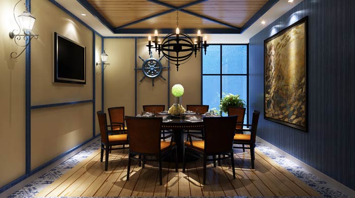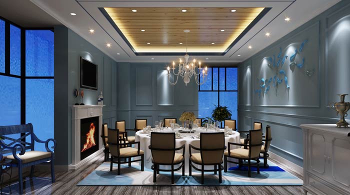 主題餐廳包廂設(shè)計:這里給人的第一感覺就是安靜、舒適,在嘈雜的都市中,一個安靜的就餐環(huán)境成為難事,在這里設(shè)計師借助海洋的寧靜,打造安靜、舒適的空間環(huán)境。