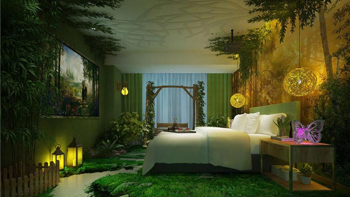 童話客房的設(shè)計:第一眼仿佛進(jìn)入了一個童話世界,在森林的盡頭住著一對夫婦,在這里快樂的生活、無憂無慮、日出而作、日落而寫,過著美滿的生活,這不正是我們所向往的生活嗎,浪漫又樸實,設(shè)計師希望讓情侶之間可以多一些理解、多一些包容。