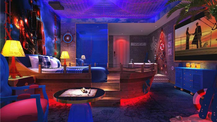 海盜船客房的設(shè)計:此處說起來是海盜船,但是設(shè)計師的取景不同,設(shè)計師取得不是人物,而是夜晚美麗的景色,在漫漫大海中我們隨風(fēng)飄蕩,頂部好像夜晚降臨的星空,在這里我們相互依偎,在這里我們看著彼此,在這里我們聽著海洋、星空的祝福,這不正是我們期待的浪漫星空。