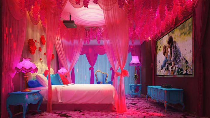 喜慶客房的設(shè)計:此處粉紅色成為主角,在這里是一個粉紅的世界,情侶們在這里仿佛脫離了世界一般,來到了一個全新的星球之中,在這里他們浪跡天涯,在這里他們相互依偎,客房的含義重在折射出內(nèi)心的希望,也意在促進(jìn)雙方內(nèi)心的互動。